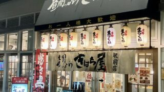 富山「きはち屋 富山駅前店」富山駅西口から徒歩約4分、毎日12時開店で昼飲みもできる居酒屋毎日ハッピーアワー実施で、ハイボール・サワー260円にウーロン茶は90円!やきとり・串カツ・おでんがメイン、名物の"とりかわ"と"つくね"がおすすめ☆