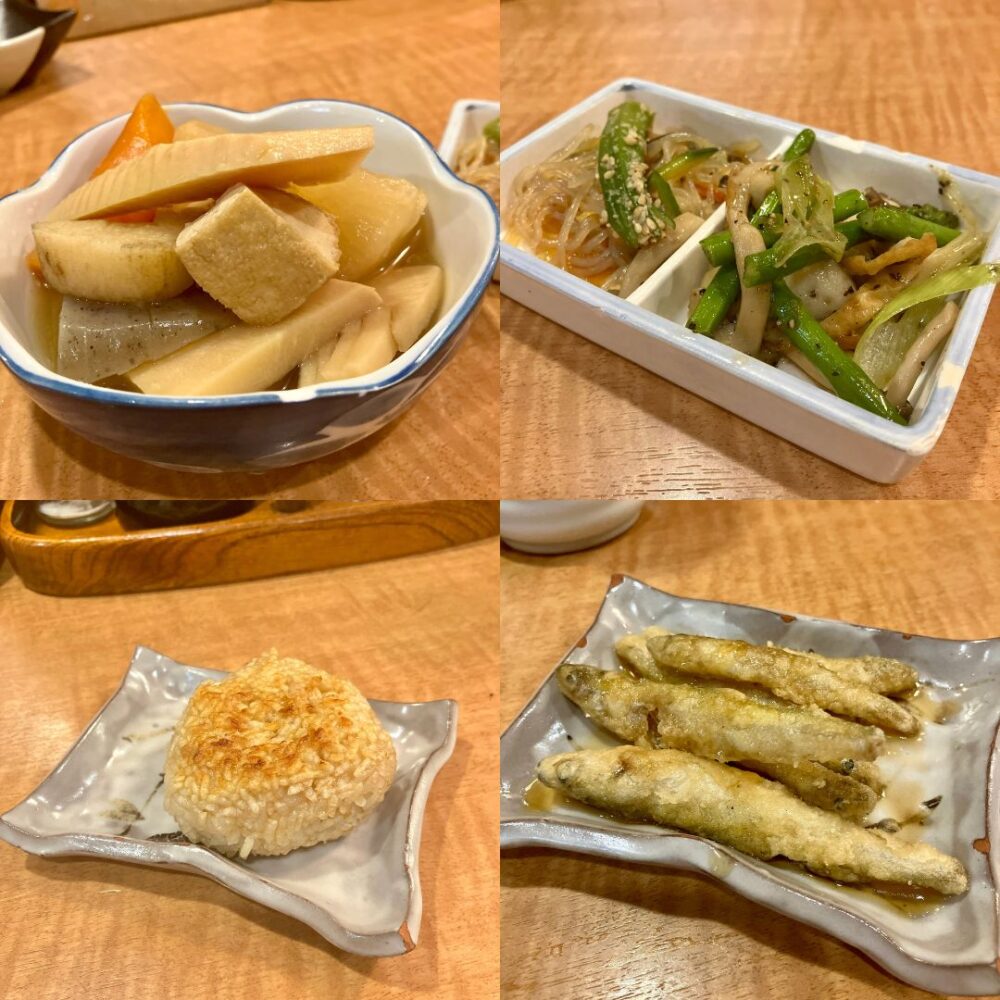 謎のお通し3品(煮物、小鉢、焼きおにぎり)に、最後はわかさぎの天ぷらまで出てきました…