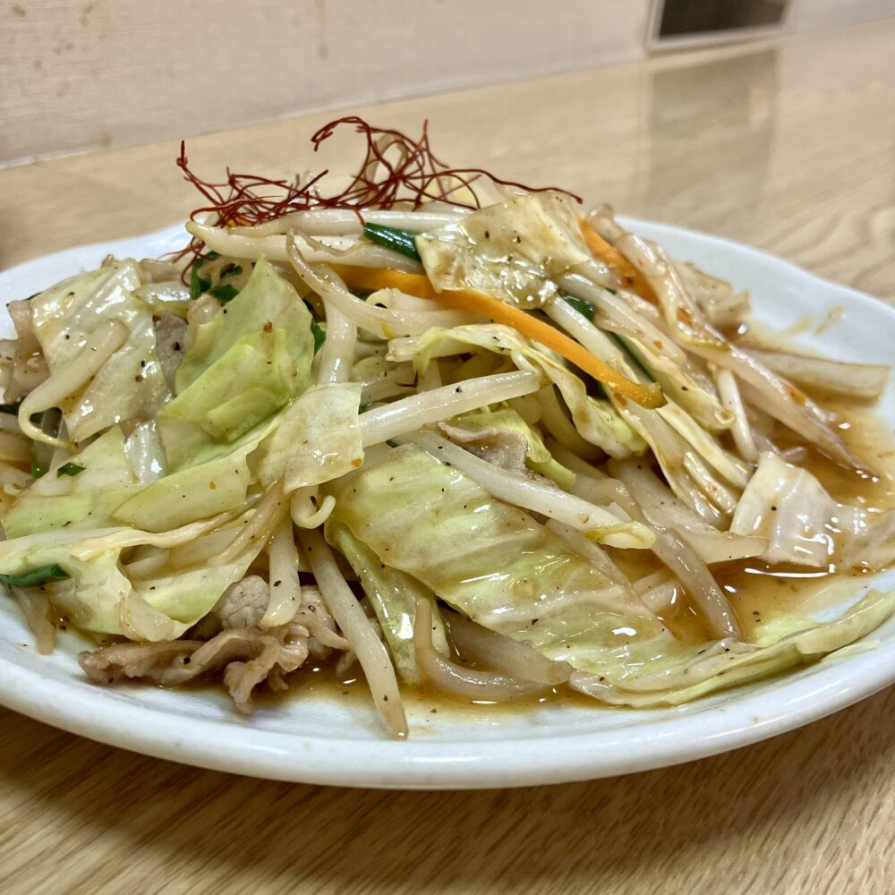 キャベツやもやしを中心に、玉ねぎ、肉、にんじん、にら等の入ったボリューム満点の炒め物