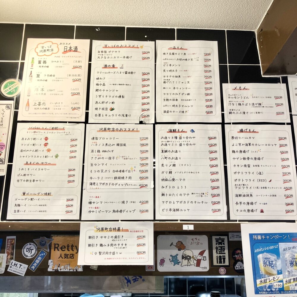 海鮮や揚げ物、”京都もん”なる京都ならではの料理もあったりと、立ち飲み屋とは思えないバラエティの豊富さ