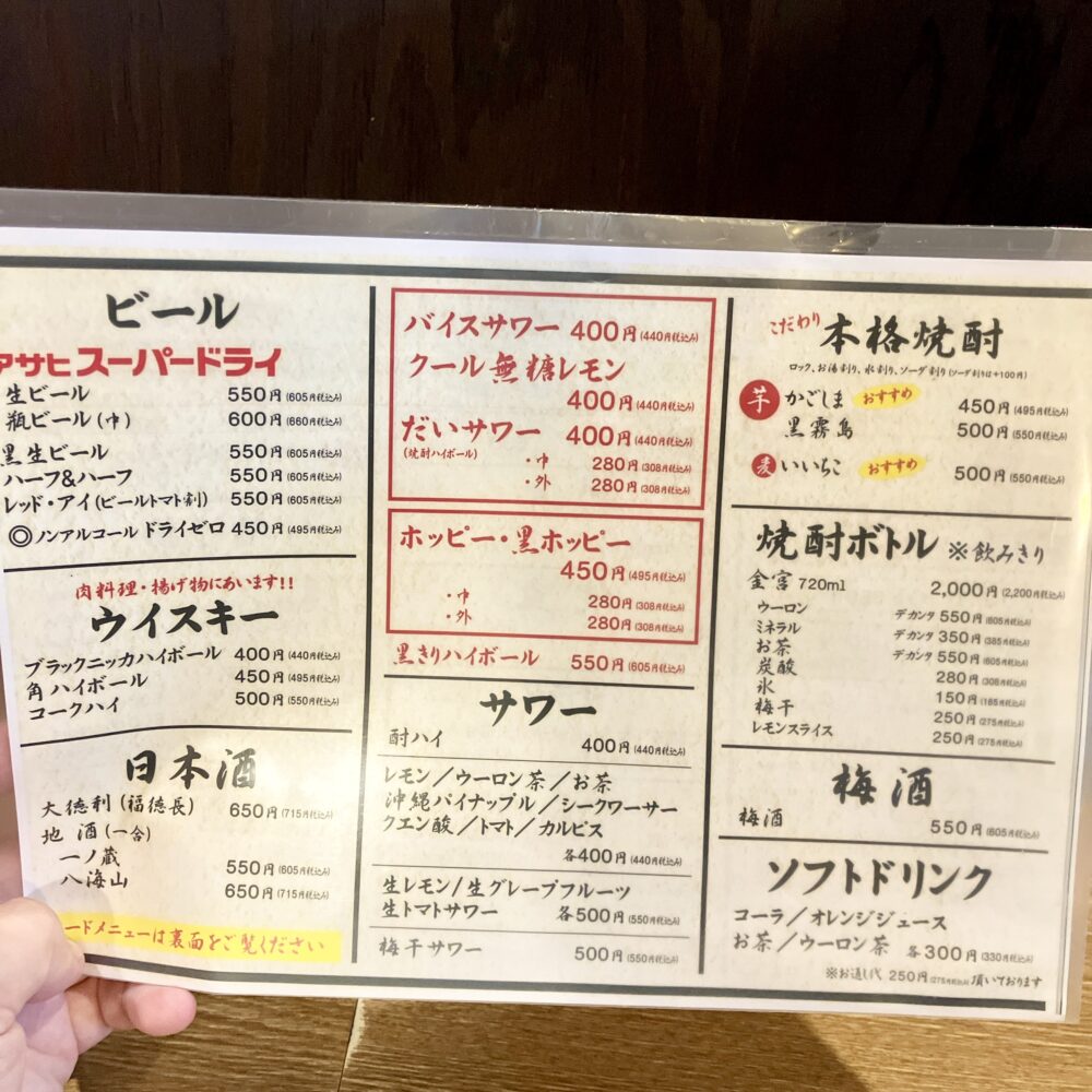 最安はサワー・ハイボール系で400円、全体的には高くもなく安くもなくと言ったところ