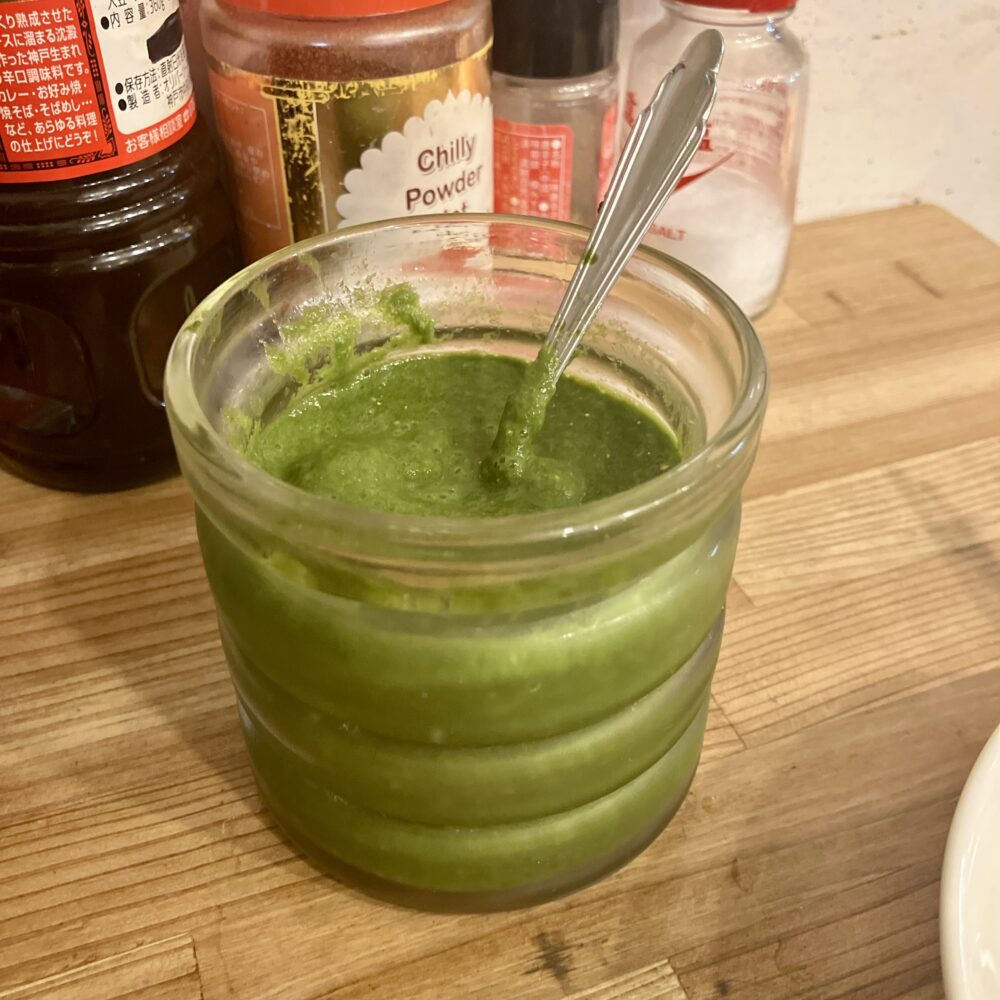 あと、料理を頼むとまずこの”謎の緑ソース“も一緒に持ってきてくれます