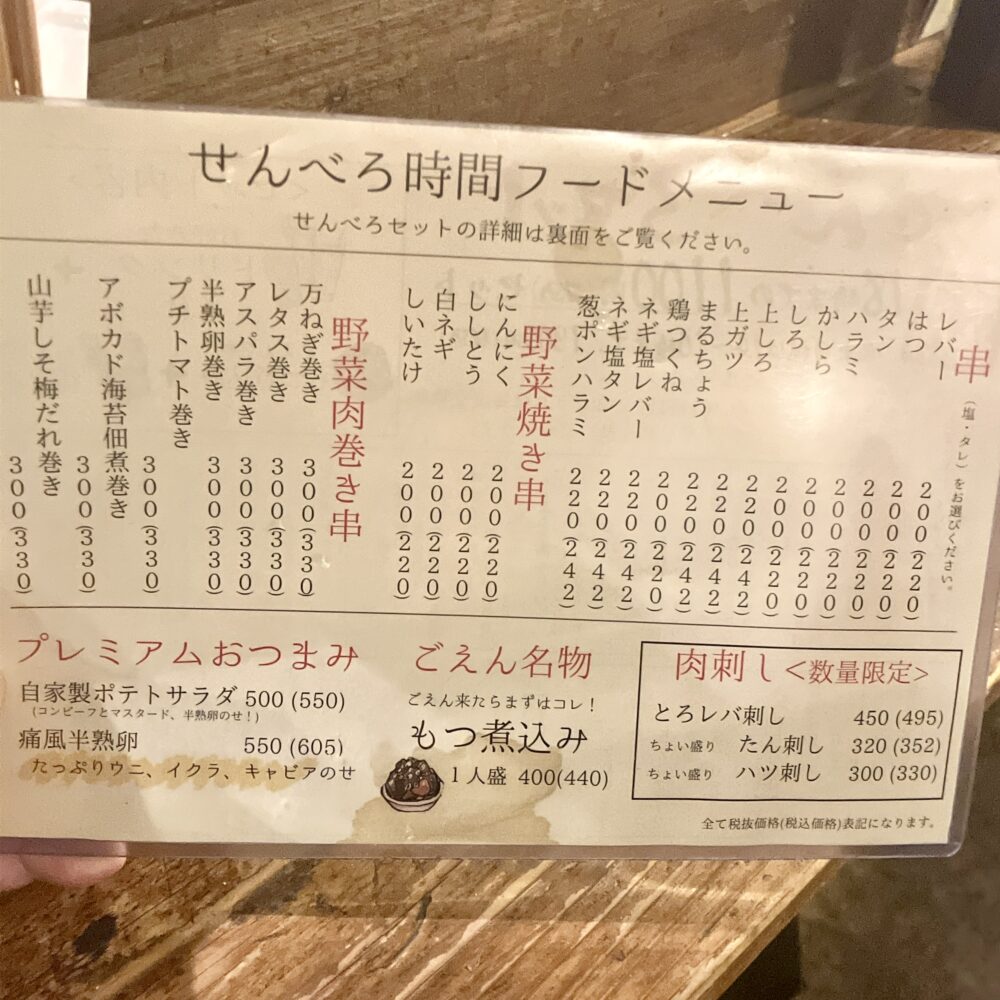 メインは串焼きで1本200円~と結構お高め、野菜焼きや野菜肉巻きもあって種類は豊富