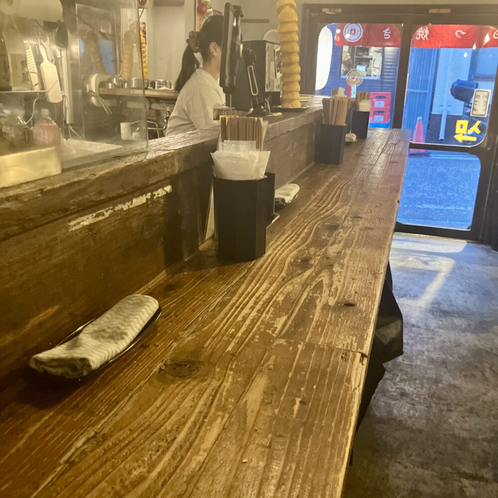 席はすべて立ち席で、L字型のカウンター、その反対側には簡易的なテーブル席があって15席程