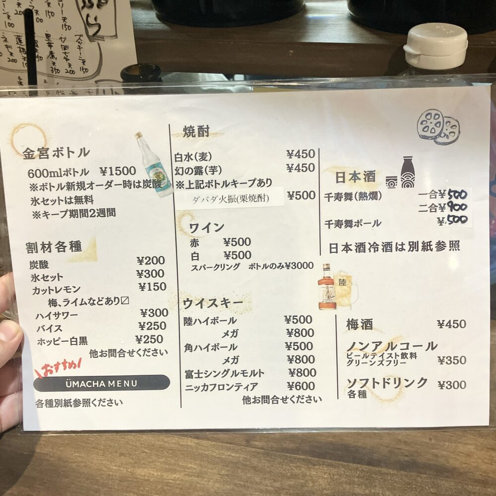 最安はチューハイで350円、その他ドリンクも500円以内のものが多く比較的リーズナブル