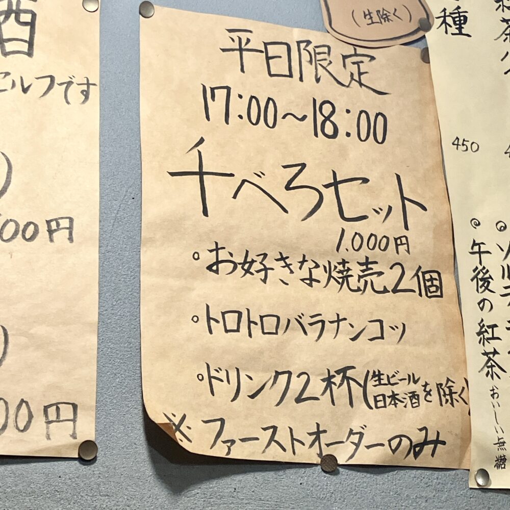 ・平日17-18時限定”千べろセット”が◎、酒2杯+焼売2個+1品で1,000円は爆安