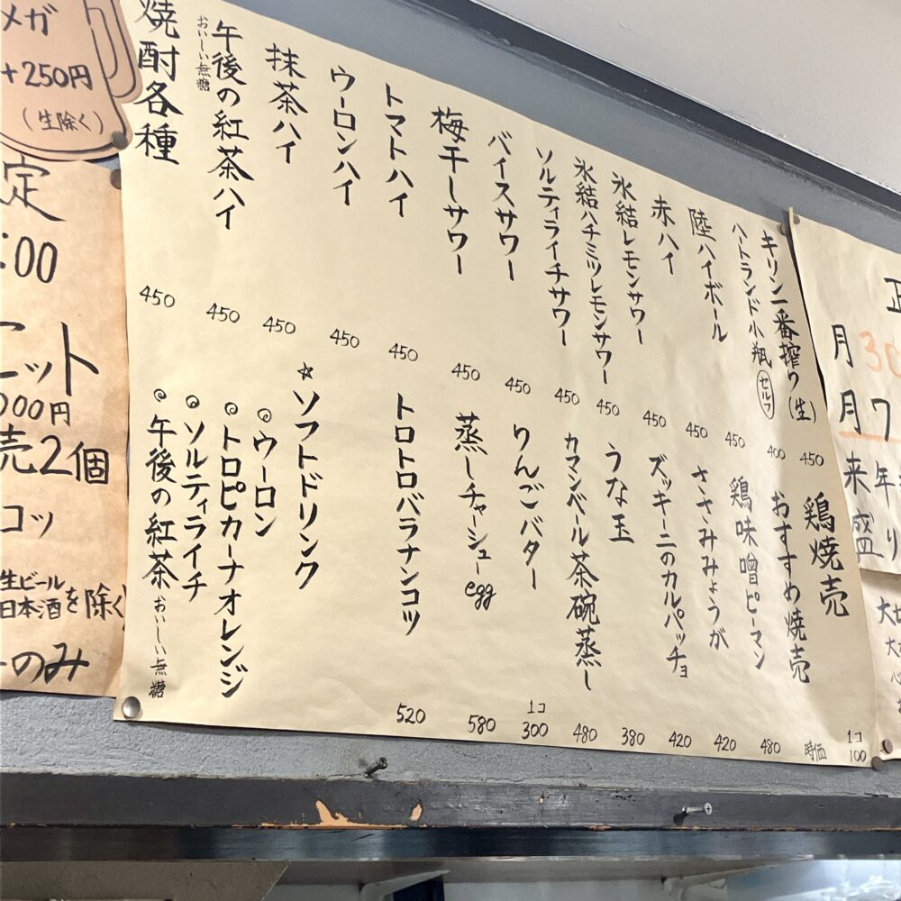 フードは1個100円の鶏焼売の他、つまみメニューがちらほら