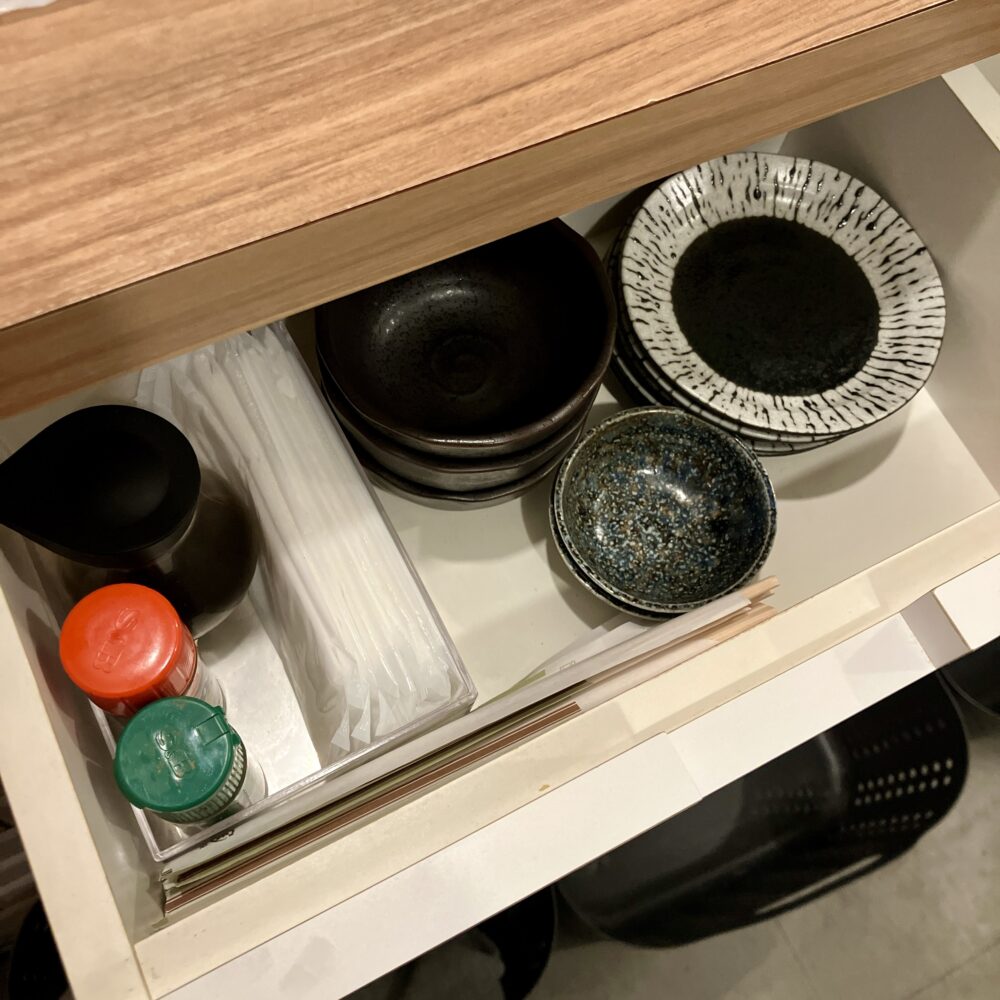 お箸や取り皿等の什器や卓上調味料は、カウンター下の引き出しに入っていました