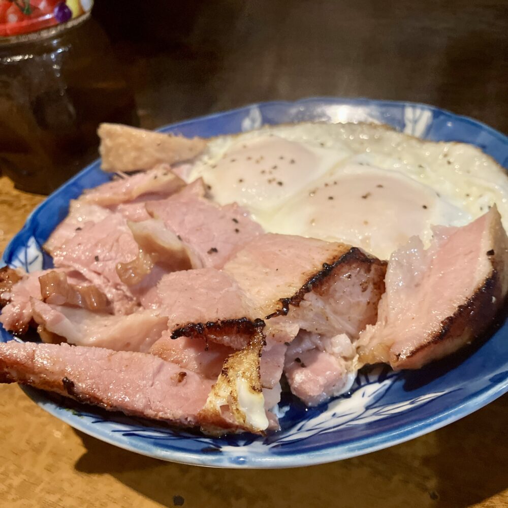 予想を遥かに超えた極厚のベーコンがドン!卵があることを忘れていまいそうな存在感^^