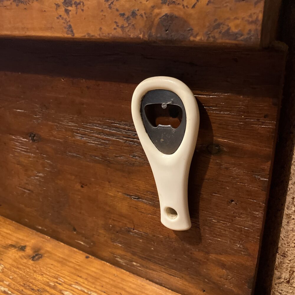 自身で冷蔵庫から取って、カウンターに置いてあるこの栓抜きを使って開栓してください。
