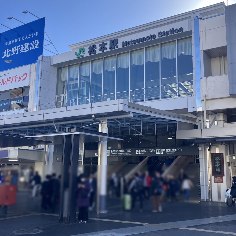 松本駅からの行き方はこんな感じです。お城口(東口)から徒歩4分くらいで着きます。
