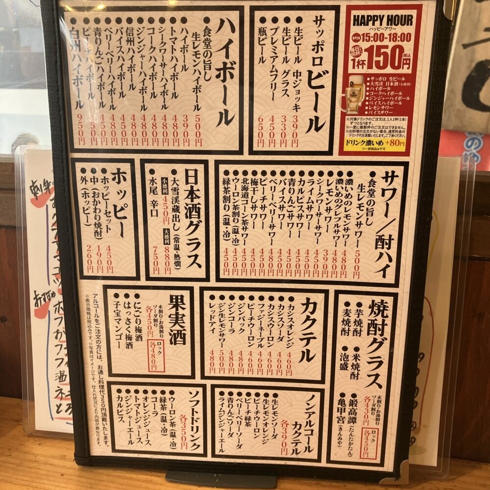 | ハッピーアワー | ◯(毎日15-18時 ドリンク150円) |